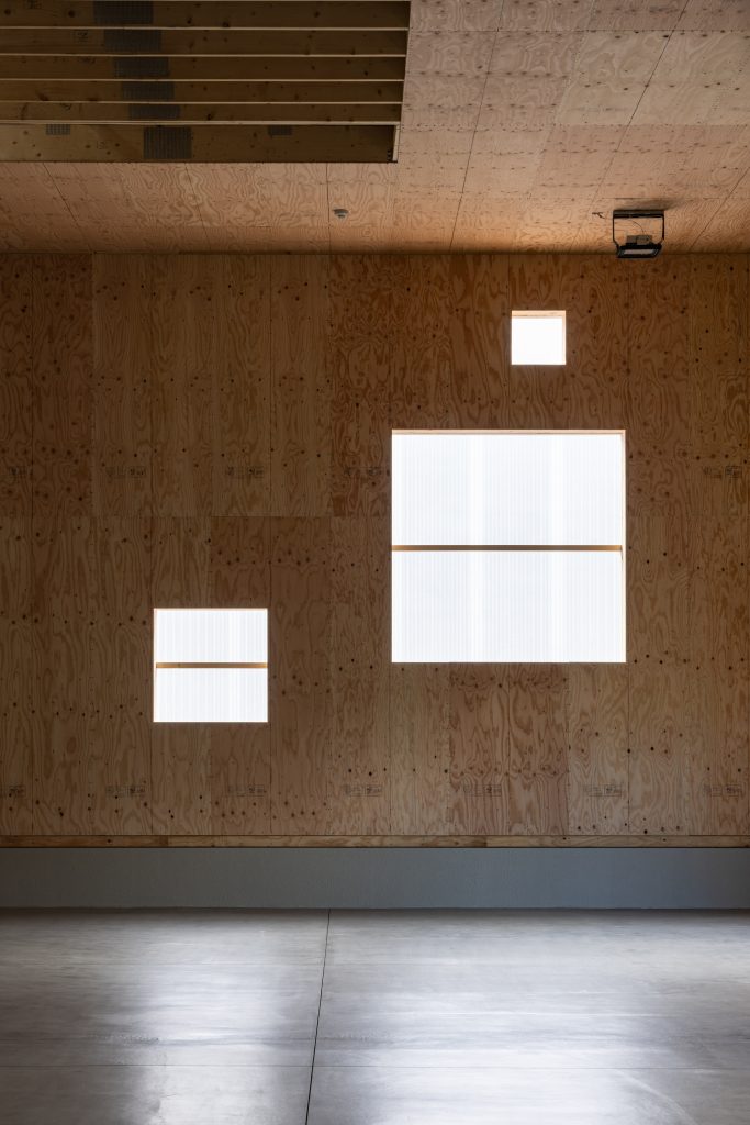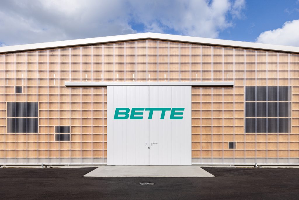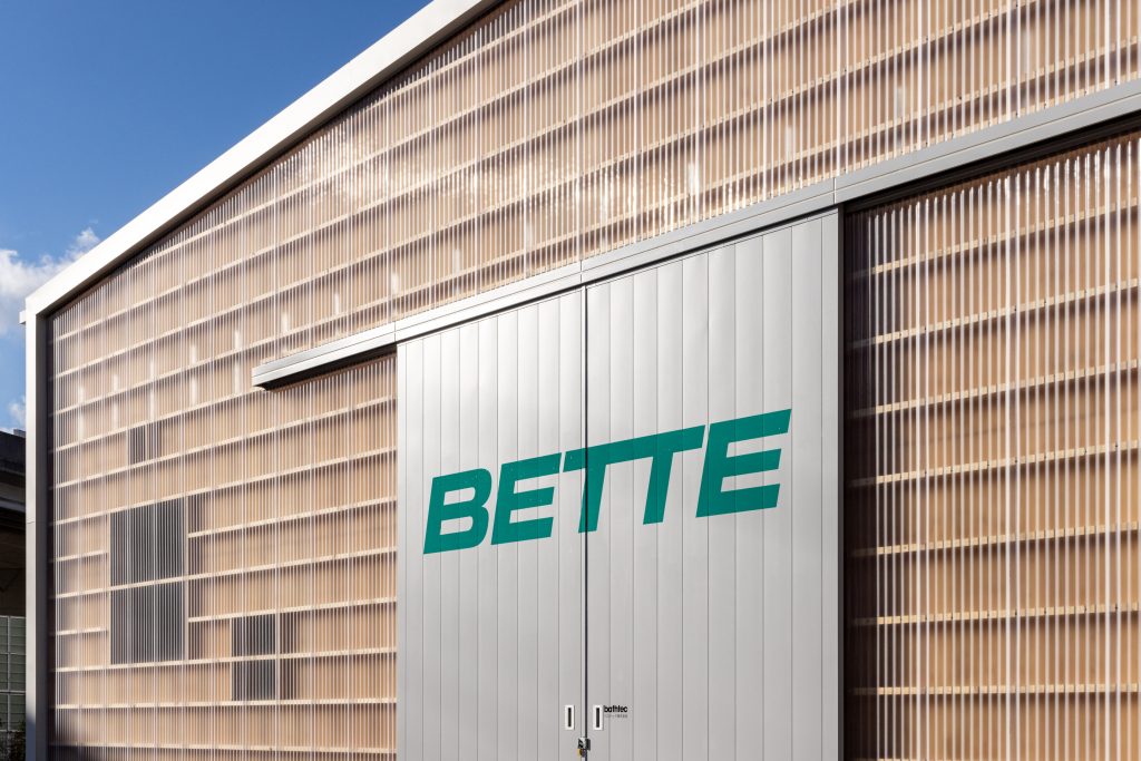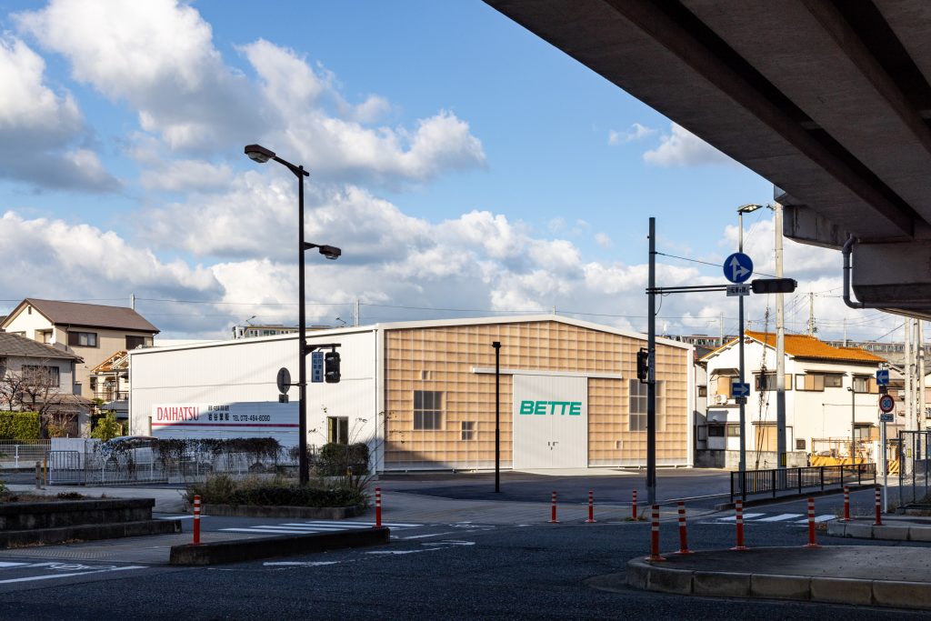 H=4.5mのスチール製大型引き分けドアや、ポリカーボネート越しの構造体に設けたいくつかの開口部。これはペイントしたりネオンサインをはめ込んだり、入るテナントの個性を表現するキャンパスとして利用しながらも、均整のとれた一つのデザインとして対応することができるアイデアです。最初の入居はドイツの浴槽メーカー、BETTEさんです。