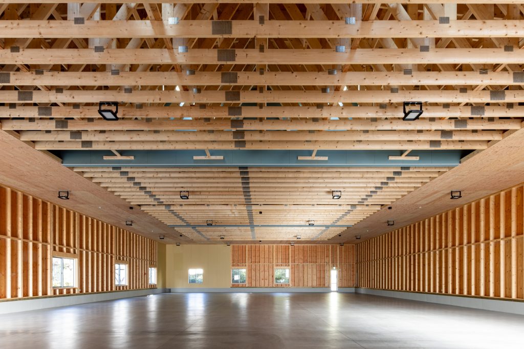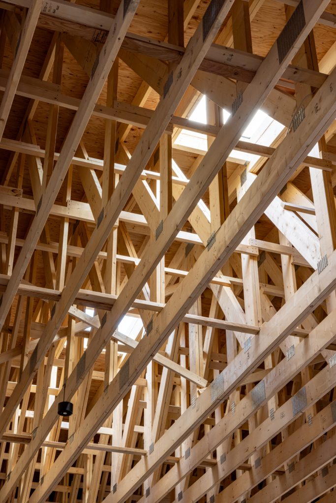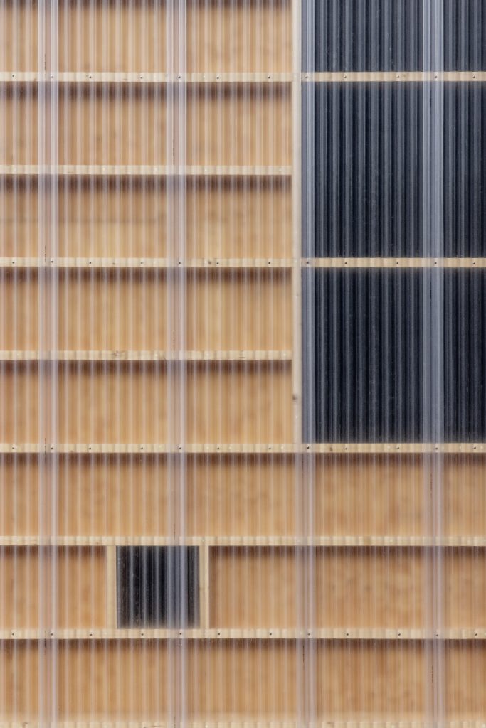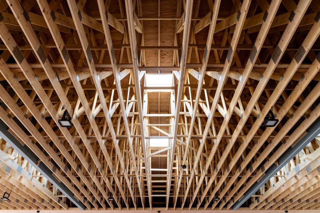 場所は泉佐野市、空連道と南海本線の交差点。相続した土地の有効活用として貸倉庫を建てるという、いたってシンプルな計画です。駐車スペースを残しながら敷地に延べ500㎡の整形な建物を配置、主体構造はコストメリットがあり、カーボンニュートラルにも配慮した木造としました。大型木造トラスを持つメーカーシステムを使うことで、木造でありながら間口20mの無柱空間を実現しました。また、外からも木造と分かるよう、外壁の一部を透明なポリカーボネートで仕上げ、構造体が透けて見えるようにしています。